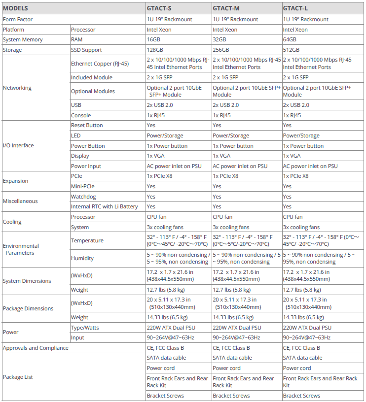 GTACT Series Hardware Specifications